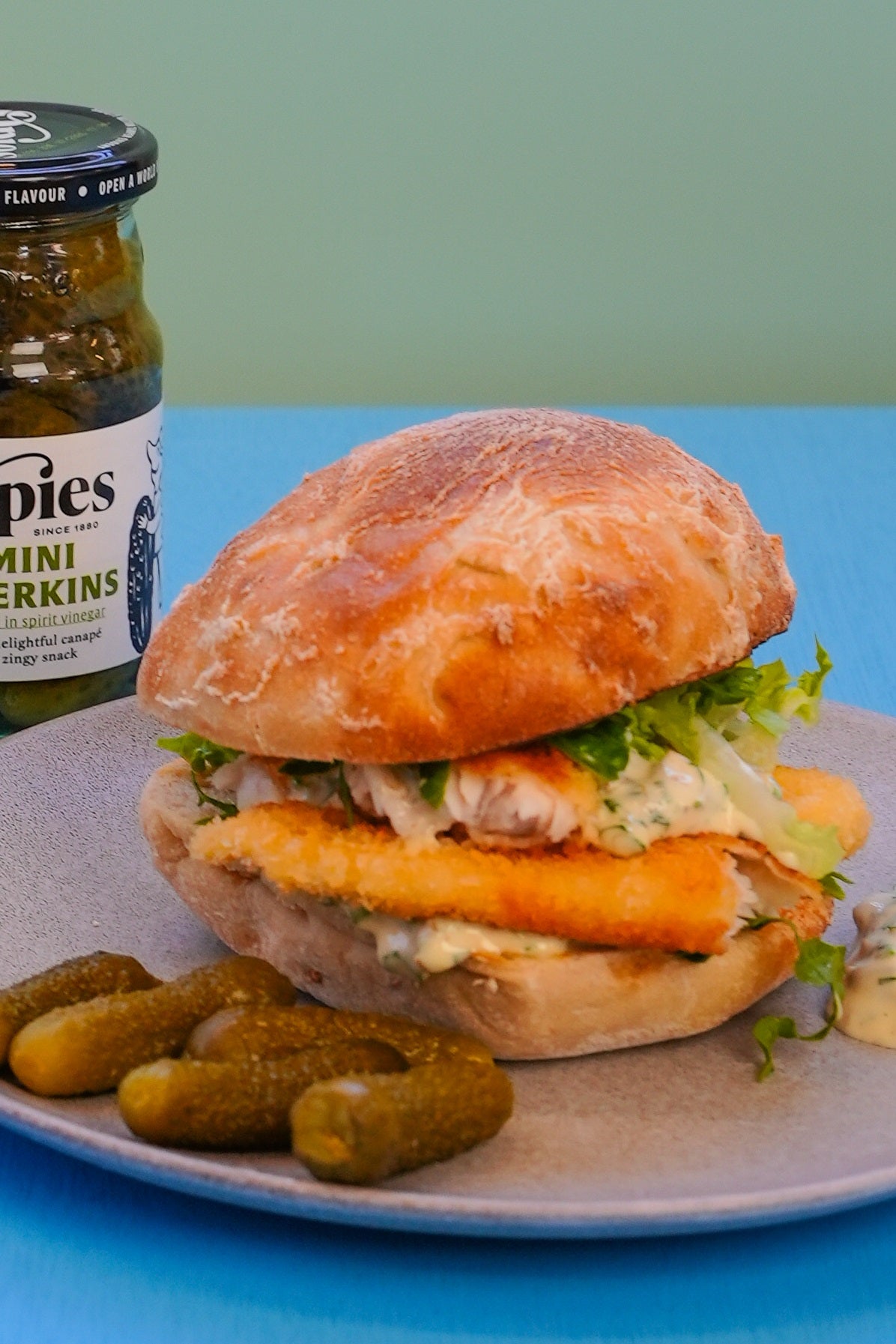 5. Toast the brioche buns lightly on the inside. Spread the base with the crushed minted peas, add the hot goujons, spoon over the tartare sauce, top with shredded salad, and finish with the bun lid.