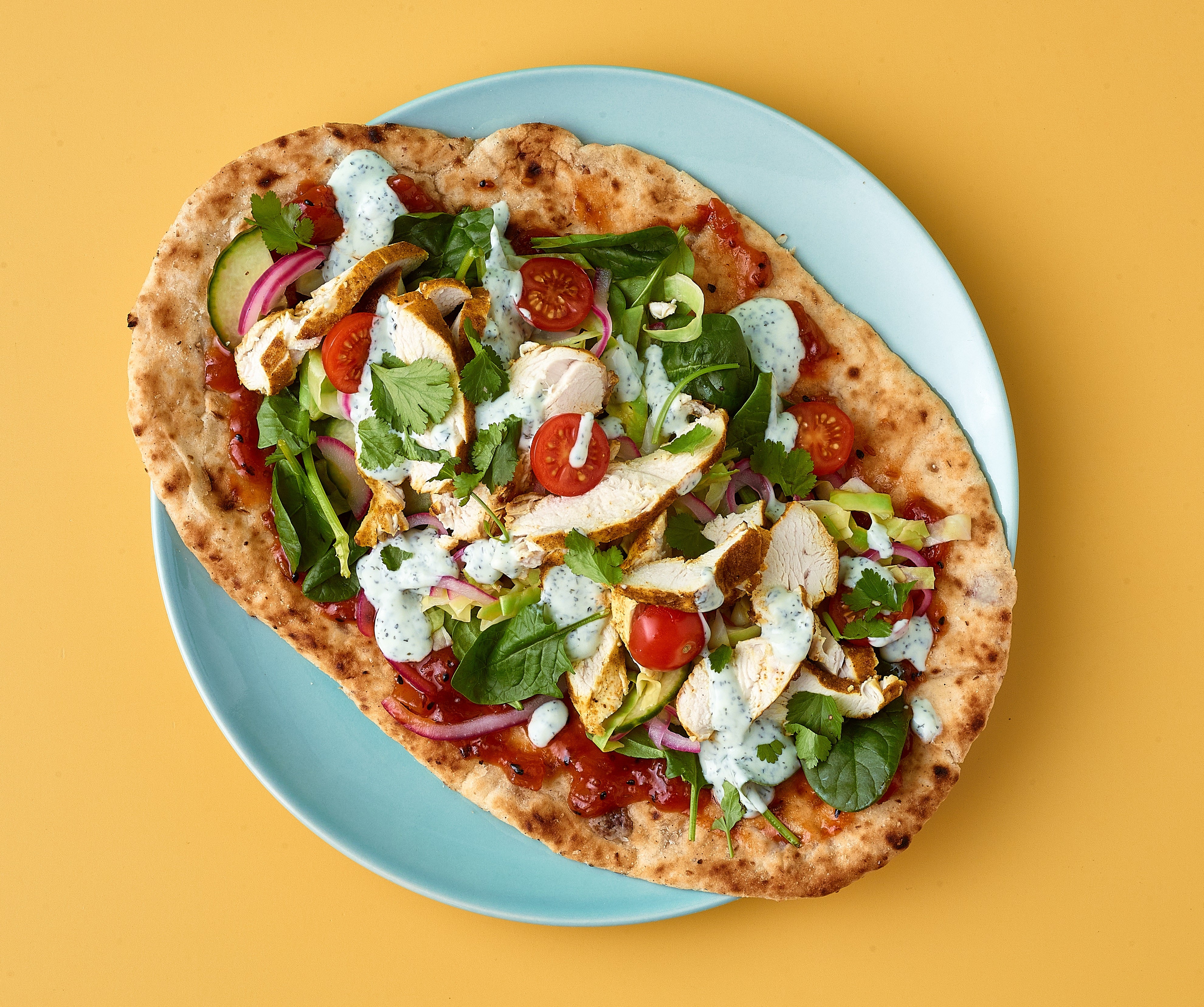 6. Spread each naan with spicy tomato chutney. Top with baby spinach, the cabbage and onion salad, shredded chicken, and cherry tomatoes. Drizzle with yoghurt sauce and garnish with coriander leaves if using.