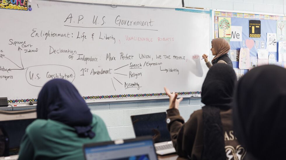 The whiteboard in their AP U.S Government class features notes about the U.S. Constitution, the First Amendment and the Declaration of Independence. They’re questioning whether these rights afforded to Americans apply to them.