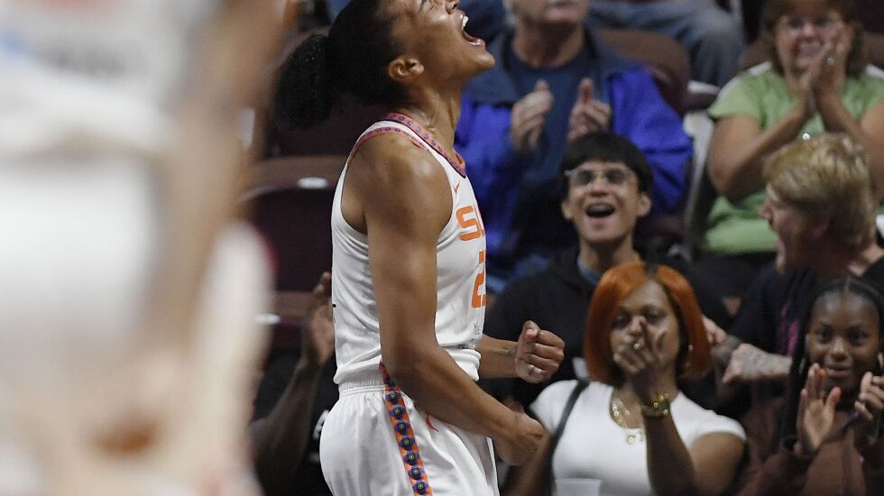 Miller moved Jones to the bench to make room for a healthy Alyssa Thomas to play alongside Jonquel Jones in the Sun’s starting lineup. Jonquel Jones had led the Sun in scoring with a 13.7-point average in the first three games; Brionna Jones was averaging 10.3 points.