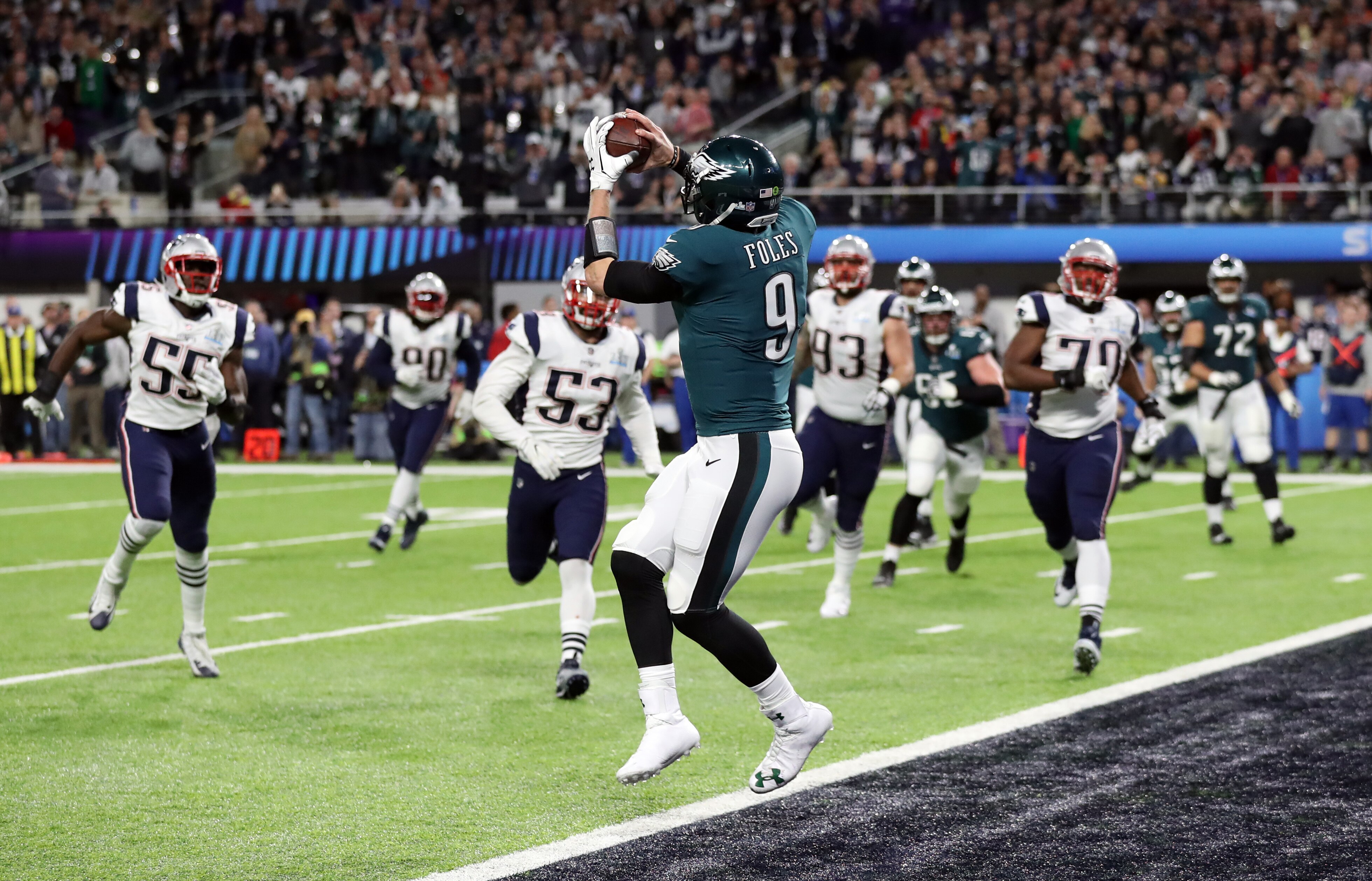 In 2018, they got their revenge, beating the Patriots in a 41-33 shootout in Super Bowl LII, highlighted by a gutsy play call on 4th and goal. The Eagles called a trick play the "Philly Special", where quarterback Nick Foles turned receiver to catch a pass in the end zone for a touchdown.