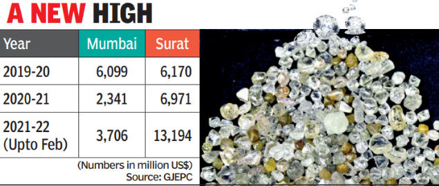 According to Gem and Jewellery Export Promotion Council (GJEPC), the rough diamond imports in Surat was nearly four times more than Mumbai, the hub of diamond trading, during the current financial year.