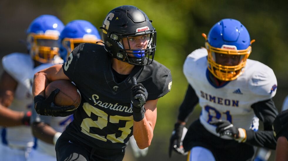 Junior Dylan Hodges broke loose for a 92-yard touchdown run late in the first half. That put the Spartans (2-0) ahead 14-0. Simeon scored on a nine-yard touchdown run by Te’shon McGee late in the third quarter to make it 21-6 but the outcome was never really in doubt.