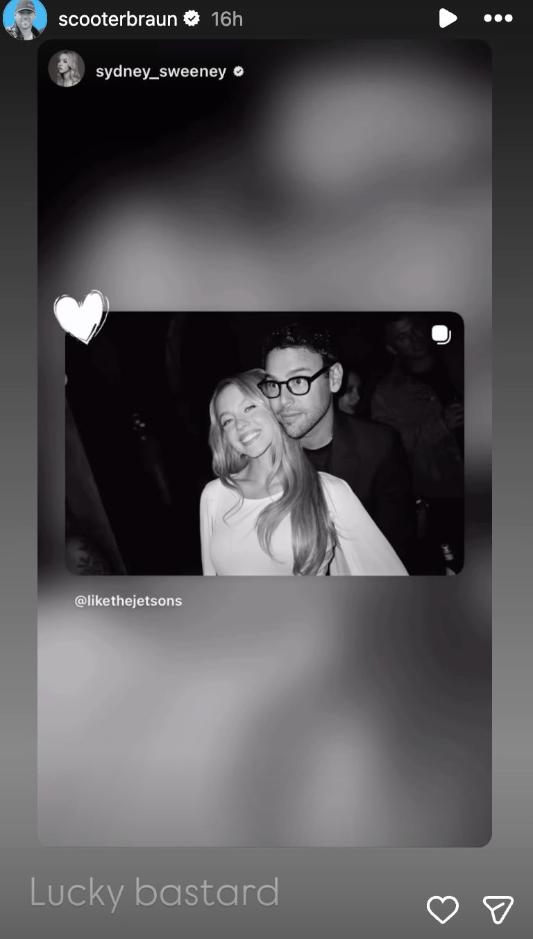 On Wednesday, Braun reshared Sweeney’s post on his Instagram Story, alongside the caption: “Lucky bastard.”