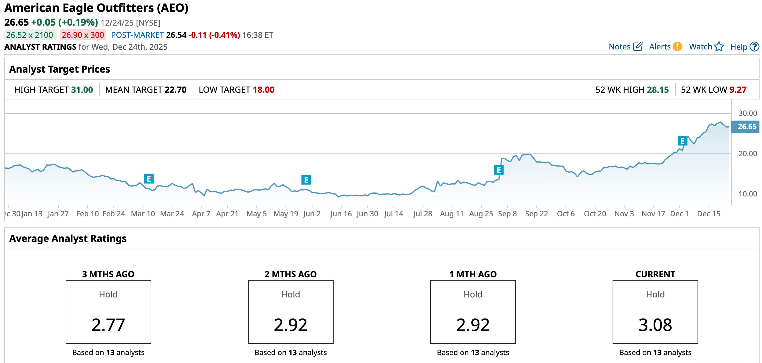AEO stock already trades above its average price target of $22.70, signaling that much optimism is priced in. However, the Street-high target of $31 implies potential upside of 16.3% from current levels.