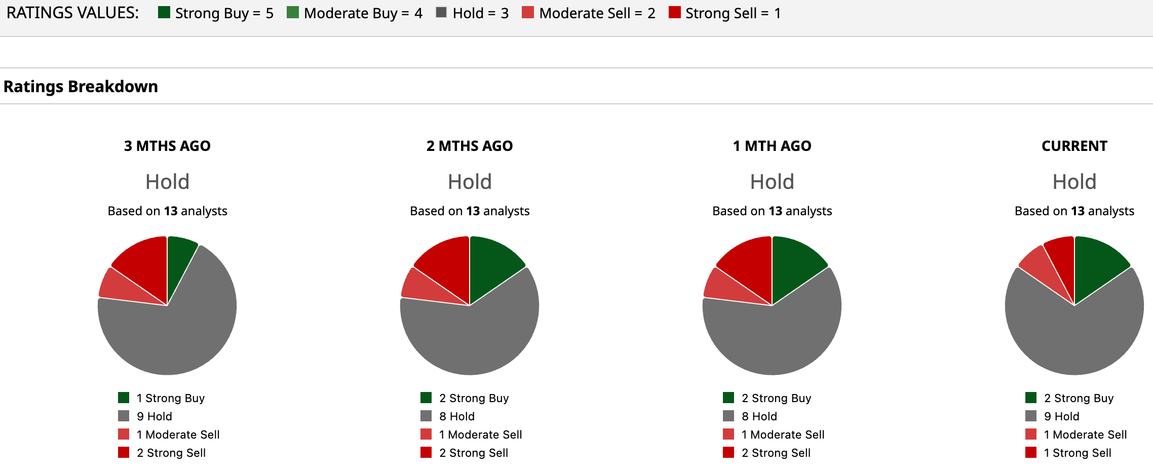 Wall Street maintains a cautious stance on AEO. The stock holds a consensus “Hold” rating, with two of 13 analysts recommending “Strong Buy,” nine advising “Hold,” one suggesting “Moderate Buy,” and one issuing a “Strong Sell,” underscoring divided conviction.