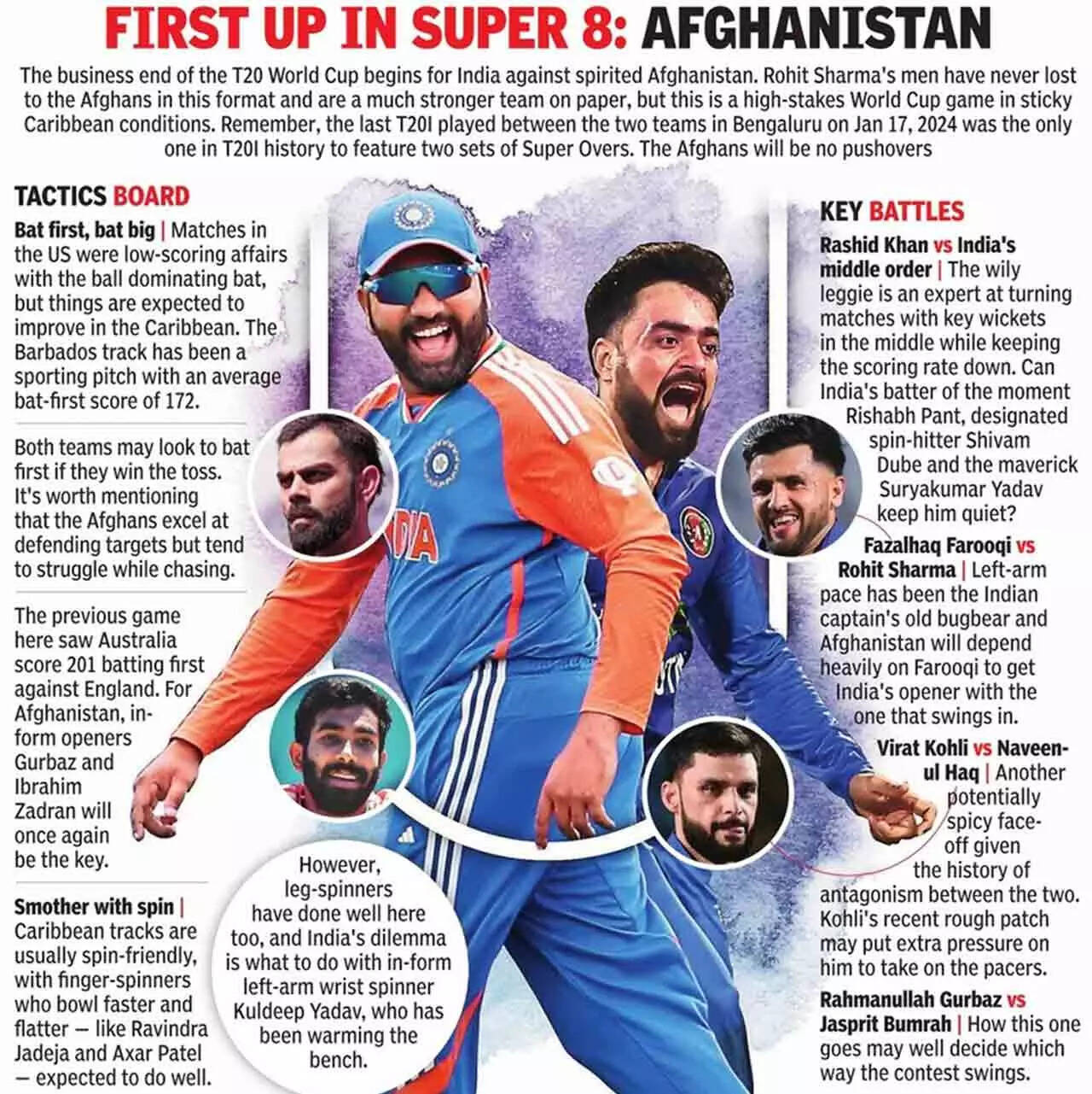 As for the batting, there's enough depth and experience in the Indian ranks to deal with any kind of Afghan threat. And with Virat Kohli due for a big one and Rohit completely at ease with his own game, there is a case for the 2007 champions to race off the blocks, as West Indies did in St Lucia the other day.