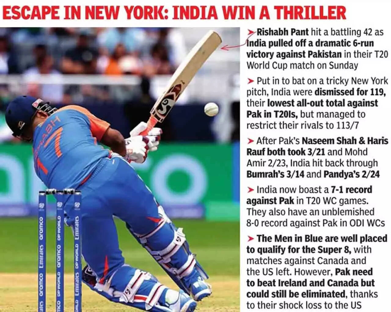 For Pakistan, their loss, coming after the shock defeat to the USA, leaves them without a point and with a lot of work to do against Canada and Ireland if they are to fight their way into the Super Eight stage.AP