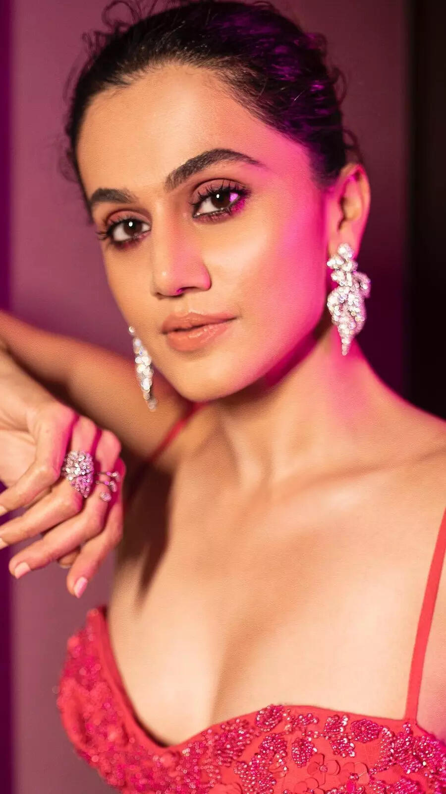 Taapsee looks radiant in this satin purple attire.