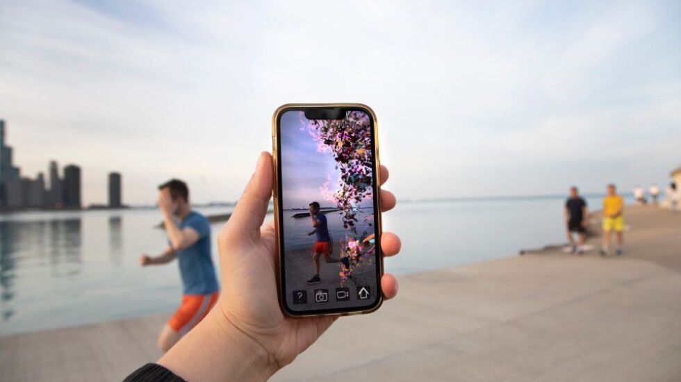She has brought an installation to Chicago that debuted in Miami and has been geo-tagged to appear over Lake Michigan near the Museum Campus so viewers who download an app can see it appear in the sky above the lake.