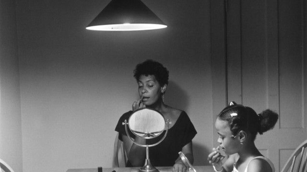 In the atrium of the hotel, visitors are greeted by the works by the prolific artist Carrie Mae Weems, whose black-and-white portrait “Untitled” (1990) depicts a mother and daughter sitting at a table doing their makeup. Weems’ sepia-toned “May Flowers: (2002) shows three young girls with flowers in their hair and on their dresses.