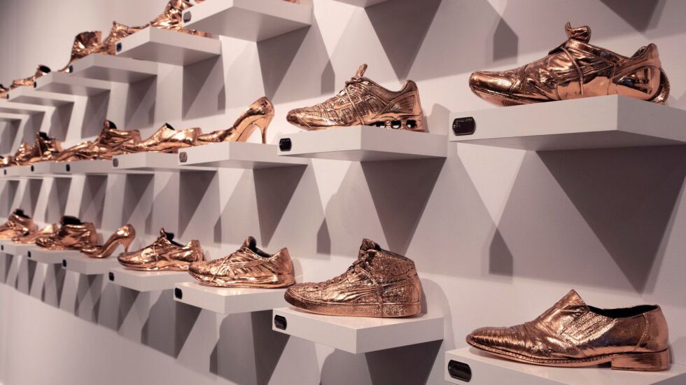 Another notable work on display is Kendall Carter’s “We” (2012), featuring 15 pairs of bronze-plated shoes that belonged to Carter and the artist’s loved ones. The shoes seem to float on wooden shelves. Ellefson says the work is a “self portrait” of the artist’s life.