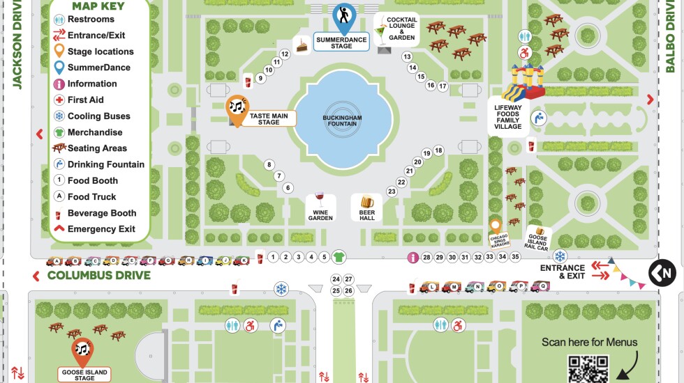 Parking: Garages are Grant Park North Garage, 25 N. Michigan Ave.; Grant Park South Garage, 325 S. Michigan Ave.; and Millennium Park Garage & Millennium Lakeside Garage, 5 S. Columbus Drive.