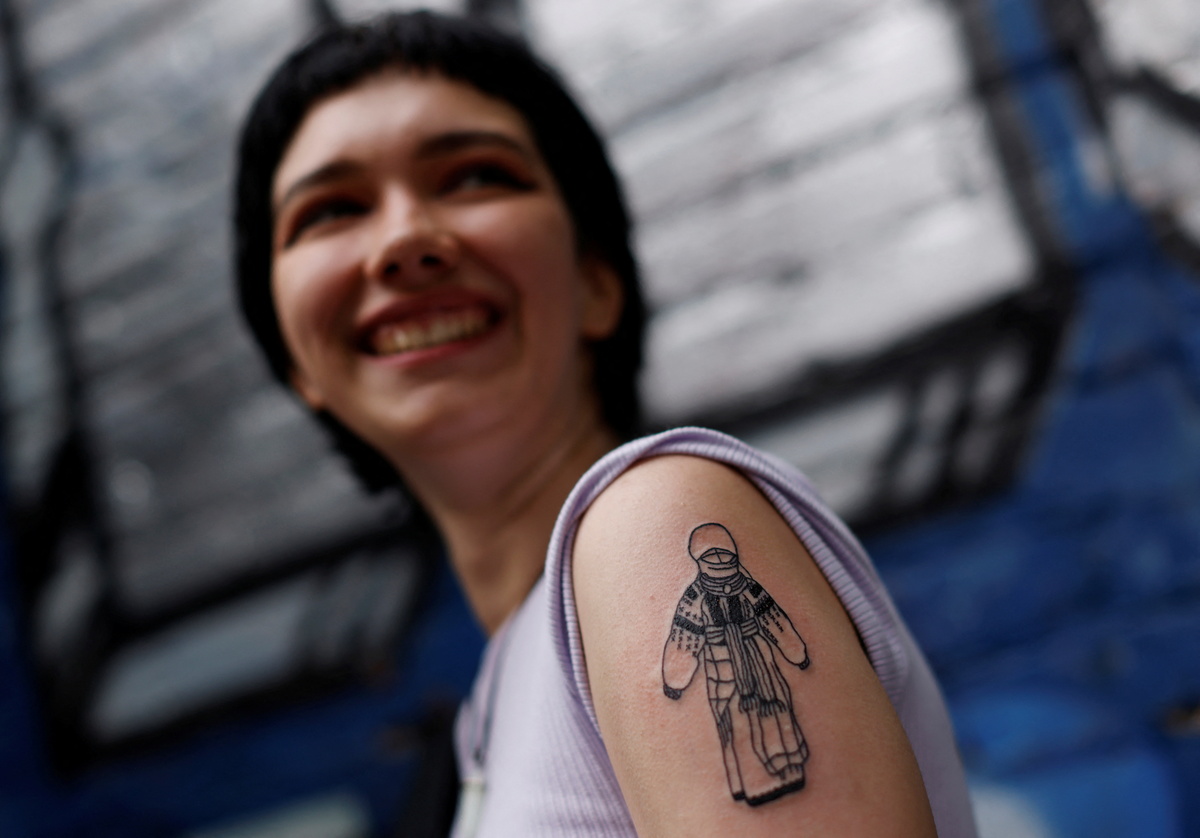 Maria Shustykova, 21, an art student, poses with her traditional Motanka (guardian angel) doll tattoo at a weekly tattoo marathon held to raise funds for the military, amid Russia's invasion, in Podil, Kyiv, Ukraine May 21, 2022. Besides acting as her personal guardian angel, Shustykova also felt a personal connection to these dolls because she used to teach children how to make them. REUTERS/Edgar Su