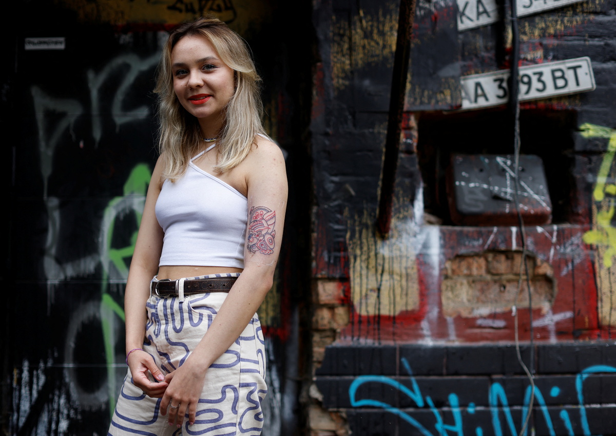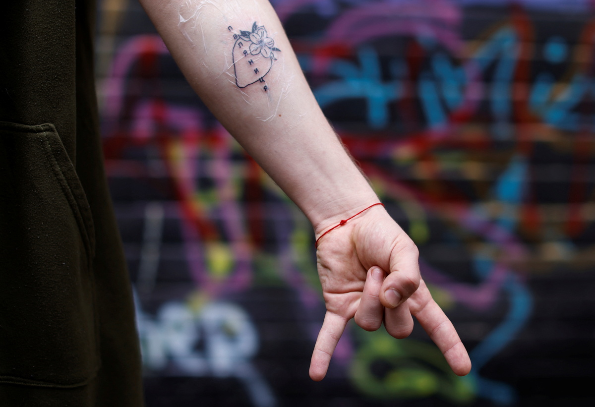 Myroslava Arnautova, 18, poses with her first tattoo at a weekly tattoo marathon held to raise funds for the military, amid Russia's invasion, in Podil, Kyiv, Ukraine May 21, 2022. Arnautova, chose a tattoo of a sketch of a bird by the 85-year-old Ukrainian artist Lyubov Panchenko, who died in April in Bucha during the invasion. "This is my first tattoo but now it feels like I had it all my life." REUTERS/Edgar Su