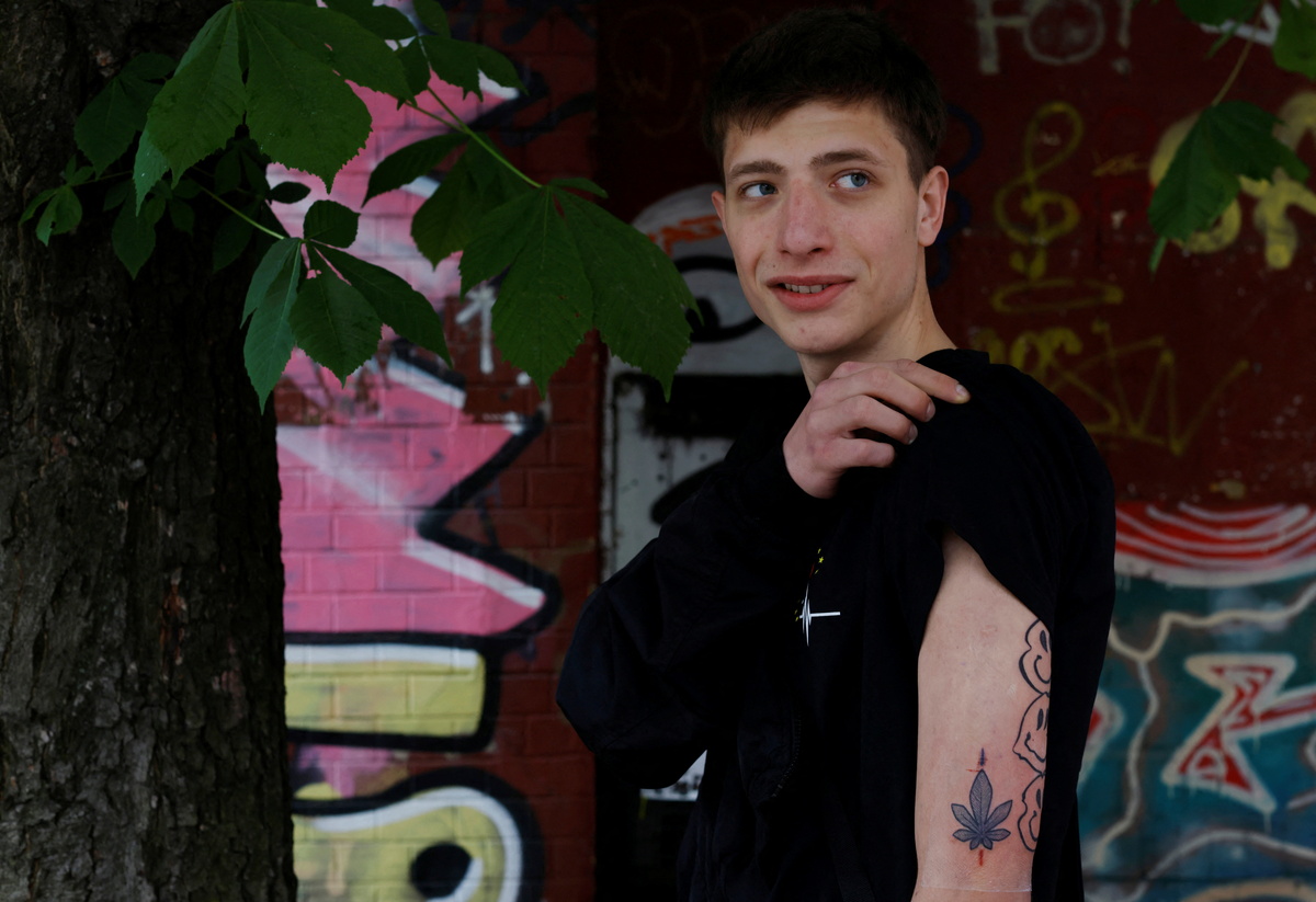 People stand outside a building where a weekly tattoo marathon is held to raise funds for the military, amid Russia's invasion, in Podil, Kyiv, Ukraine May 21, 2022. REUTERS/Edgar SuDanylo Rudenko, 19, shows his new tattoo at a weekly tattoo marathon held to raise funds for the military, amid Russia's invasion, in Podil, Kyiv, Ukraine May 21, 2022. Rudenko chose a tattoo of a strawberry (Polunytsya in Ukrainian) mocking a Russian TV anchor's mispronunciation of Palyanytsya, which is a type of Ukrainian hearth-baked bread. REUTERS/Edgar SuZakhar Tokar, 19, poses with his chestnut leaf tattoo next to a chestnut tree at a weekly tattoo marathon held to raise funds for the military, amid Russia's invasion, in Podil, Kyiv, Ukraine May 21, 2022. The chestnut leaf is a symbol of Tokar's home city Kyiv. REUTERS/Edgar SuMaksym, 18, a military cadet, poses after getting his first tattoo at a weekly tattoo marathon held to raise funds for the military, amid Russia's invasion, in Podil, Kyiv, Ukraine May 21, 2022. Maksym chose an old Slavic symbol of Valkirii (Valkyrie) which he said symbolises "honour, justice and wisdom". REUTERS/Edgar Su