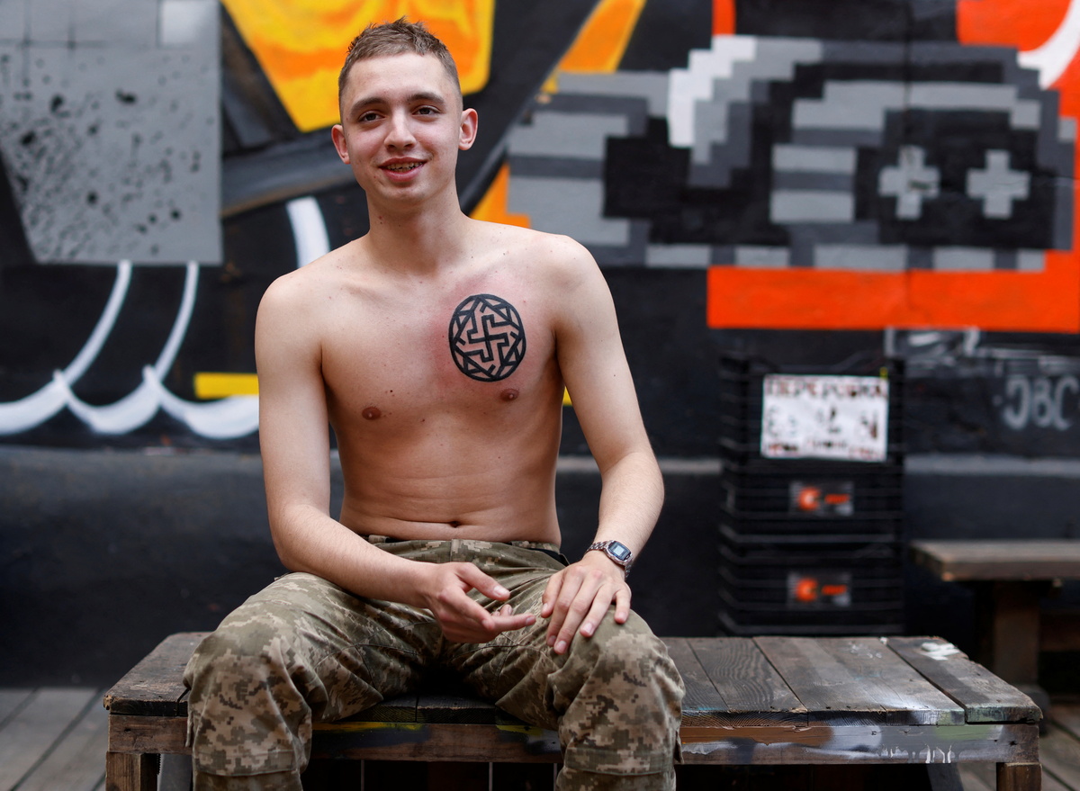 Maksym, 18, a military cadet, gets his first tattoo at a weekly tattoo marathon held to raise funds for the military, amid Russia's invasion, in Podil, Kyiv, Ukraine May 21, 2022. Maksym chose an old Slavic symbol of Valkirii (Valkyrie) which he said symbolises "honour, justice and wisdom". REUTERS/Edgar Su
