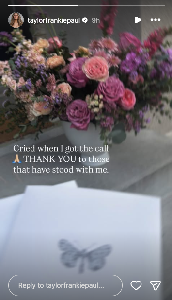 The Secret Lives of Mormon Wives star, 31, shared her reaction to the news on Instagram, writing over a picture of a bouquet of flowers: “Cried when I got the call. THANK YOU to those who have stood with me.”