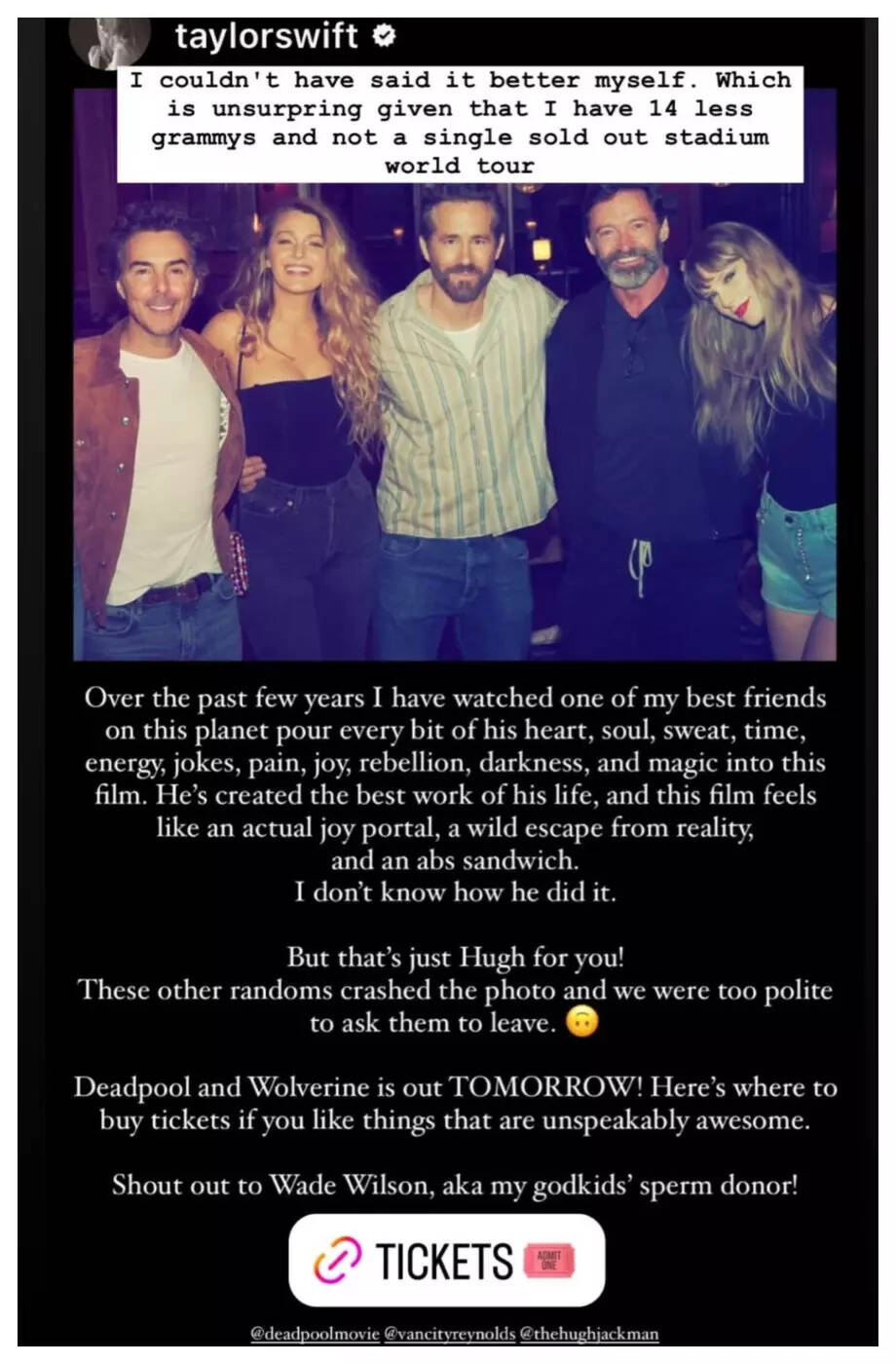 Ahead of its grand premiere, Swift took to Instagram Stories to wish the team the best and to also share a few heartfelt words of love and admiration for the film's leading men - Ryan Reynolds and Hugh Jackman.