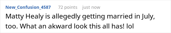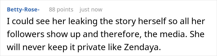 “Lol nobody knew she was dating him until 4 months after the fact and their engagement was announced two weeks after he proposed. Do you really think they’re going to give this info out? They’re probably already married lol.”