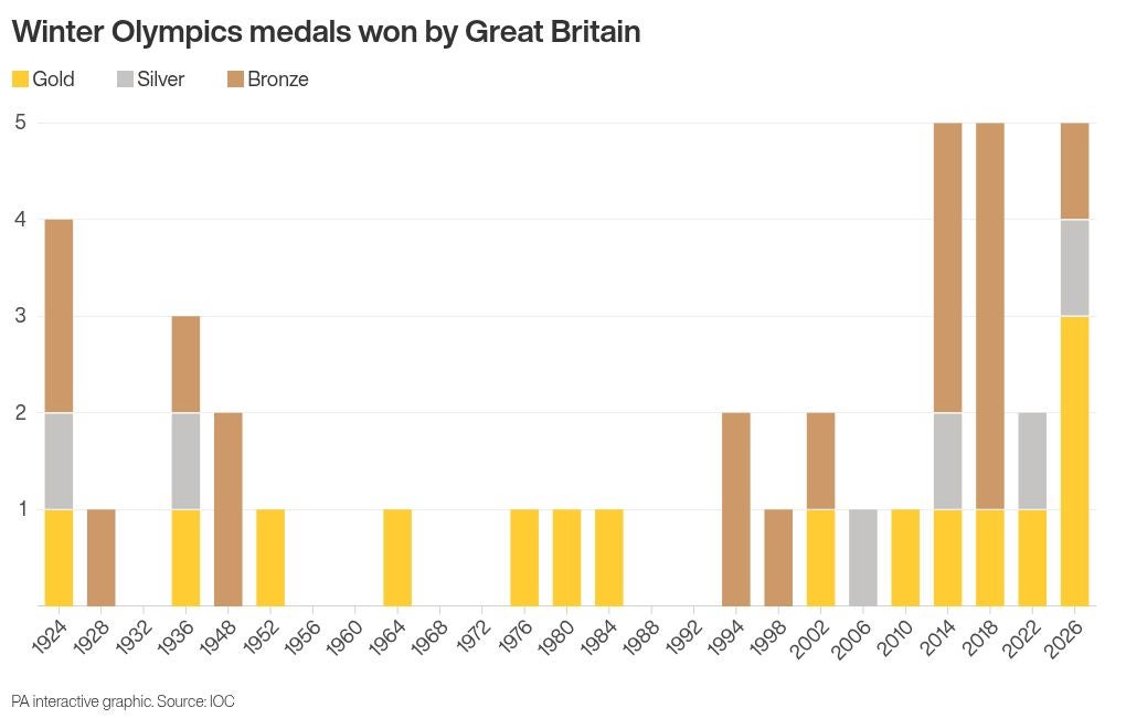Five total medals matches Britain’s best winter tally, with the best previous performance being one gold, one silver and three bronze medals at Sochi 2014, followed by a gold and four bronze at Pyeongchang 2018.