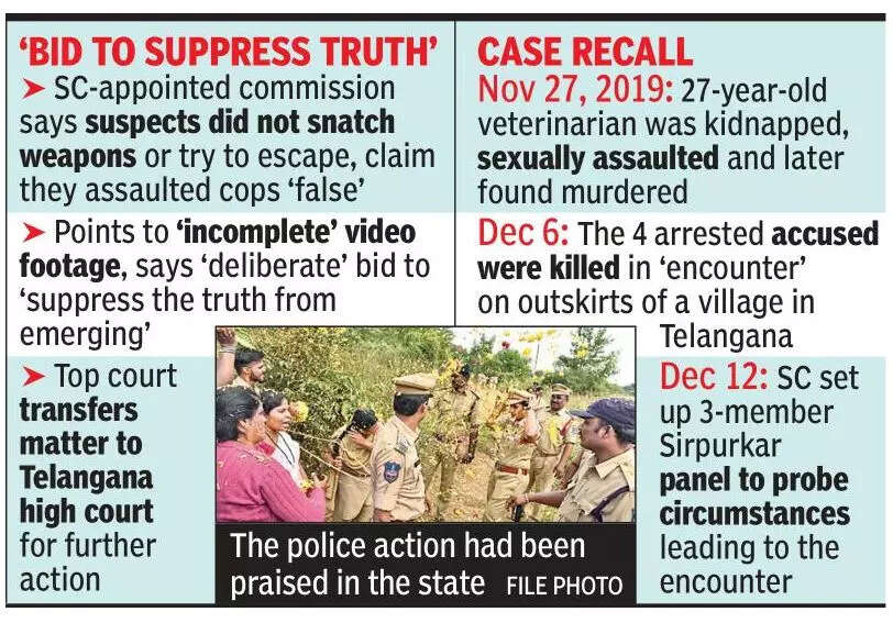 NEW DELHI/HYDERABAD: The Supreme Court-appointed inquiry commission, headed by Justice V S Sirpurkar, has found the 2019 encounter killing of four arrested accused in the rape and murder of a veterinarian in Telangana fake and fastened murder charges against all 10 policemen involved in the act.