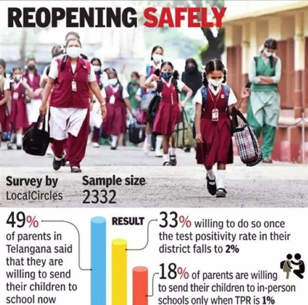 Sanitation in schools remained a concern with parents asking school authorities about the Covid protocols and measures being taken on the school premises. With the state giving its nod to resume physical classes, LocalCircles conducted a survey in which 49% of parents in Telangana said that they are willing to send their children to school now and another 33% willing to do so once test positivity rate in their district falls to 2%.
