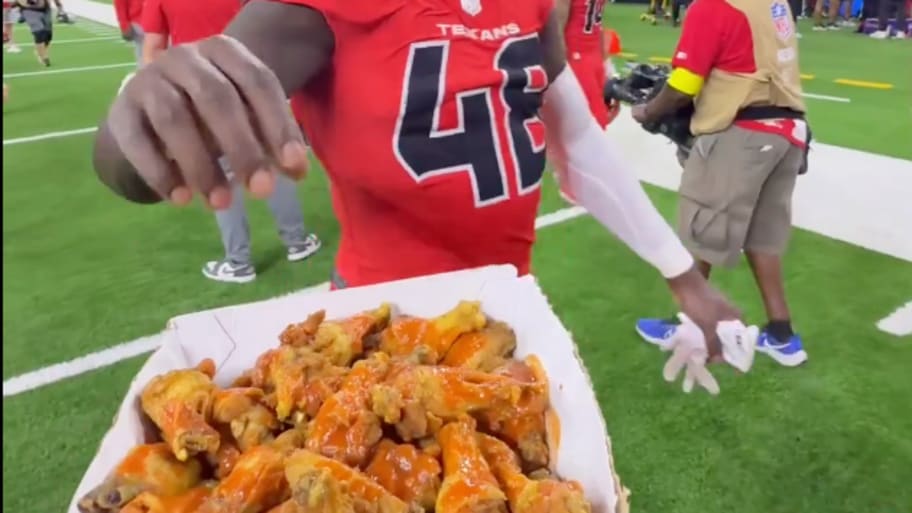 After securing the victory with an interception in the game's final seconds there was nothing left to do but celebrate and replenish calories and Houston found a way to kill two birds with one stone in the form of a big ol' thing of buffalo wings, which were presented to players making their way off the field.