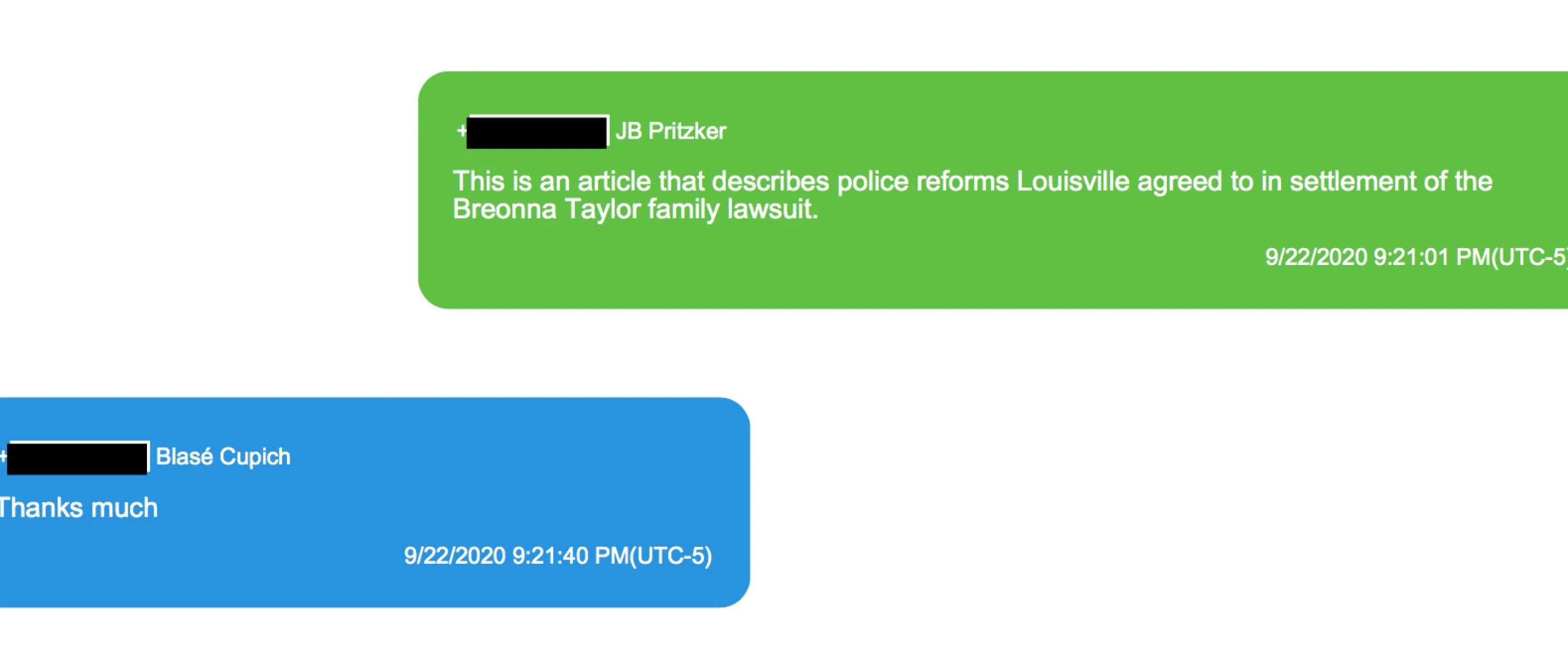 Within an hour, Pritzker texted back the first in a series of links to news stories about Breonna Taylor, a young Black woman killed in a bungled police raid in Louisville, Kentucky, in March 2020. One of those links was to a story by The New York Times with the headline: “Breonna Taylor’s Life Was Changing. Then the Police Came to Her Door.”
