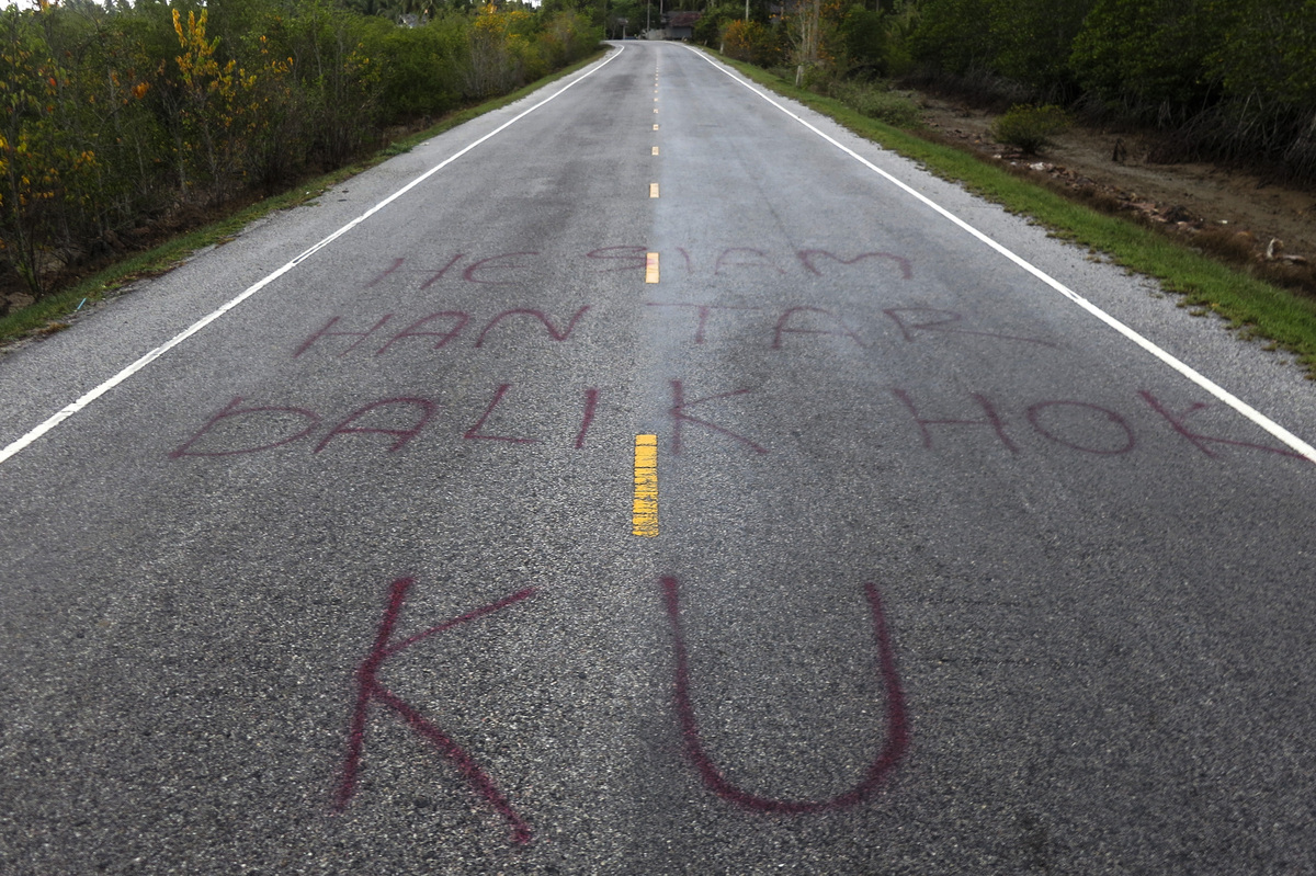 FILE PHOTO: Separatist graffiti is seen on a road near Pattani June 6, 2014, one of three southernmost provinces of Thailand where government troops have fought Muslim insurgents since 2004. Graffiti reads "Hey Siamese - bring back our rights" REUTERS/Andrew RC Marshall