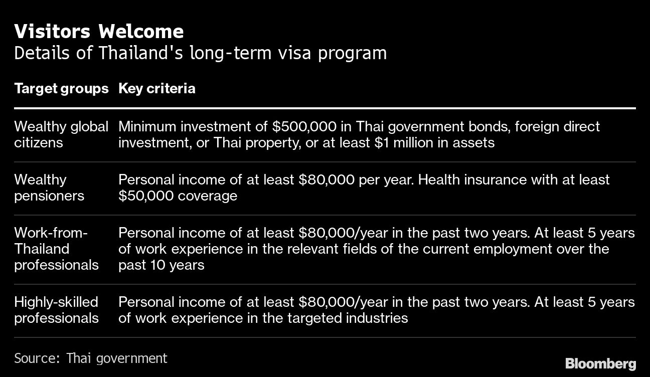 Top professionals, eligible high net-worth individuals and retirees can start applying online from Thursday to stay for as long as 10 years in Thailand, according to Chayotid Kridakon, an adviser to Thailand’s prime minister. The government has set the target of attracting one million wealthy or talented foreigners to the country over the next five years, he said at an event in Bangkok.