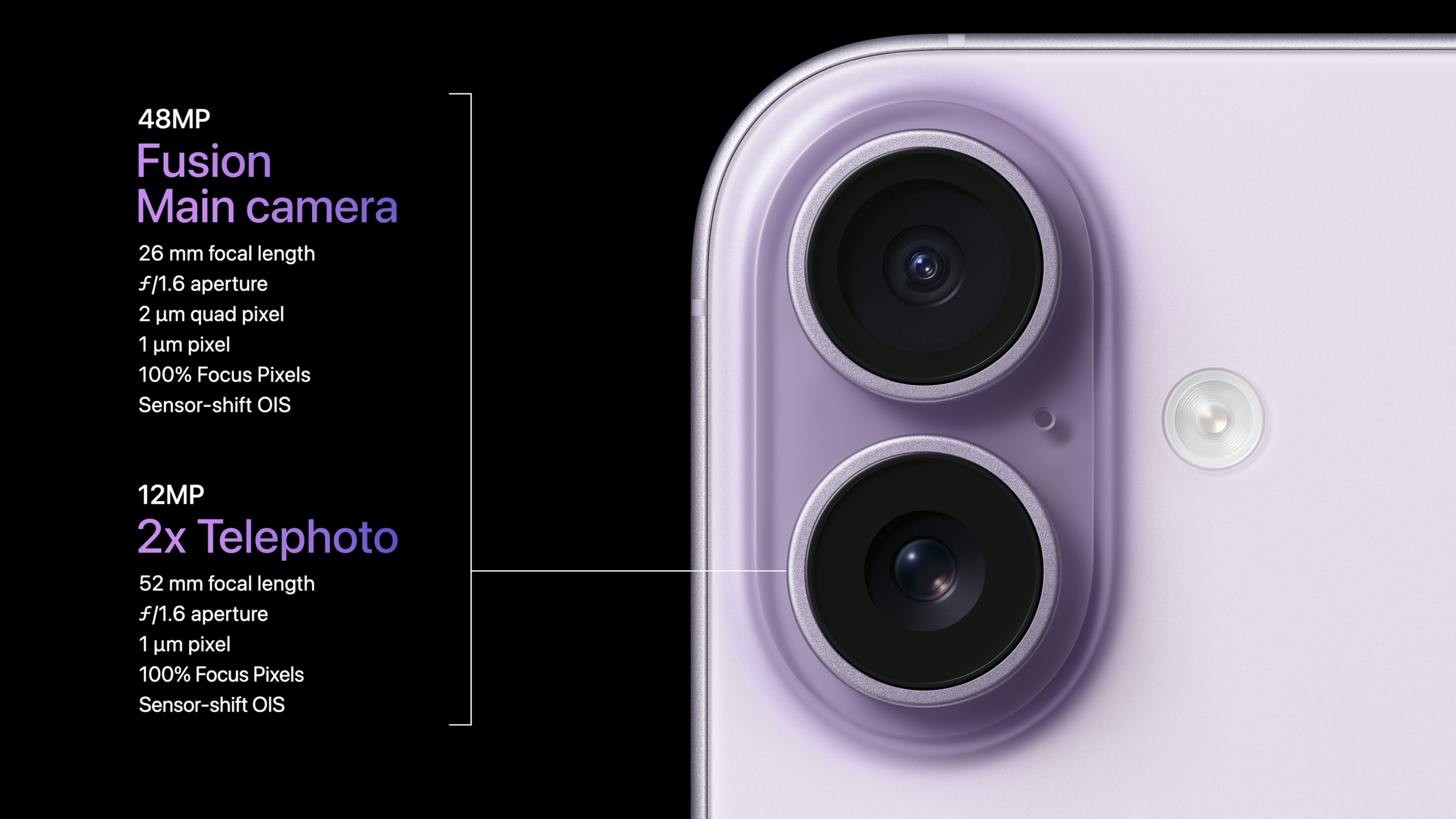 On the rear, the Dual Fusion camera system now includes both a 48MP main camera and a 48MP ultra-wide camera. This gives you 24MP or 48MP images at 0.5x zoom, and 1x zoom, as well as a 2x zoom at 12MP. Previously, the iPhone 16 only had a 12MP ultra-wide camera, which meant a downgrade in quality for wider shots.