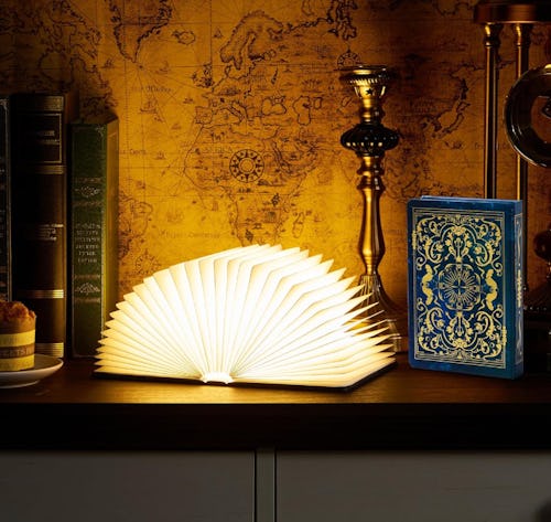 Any reader would fall in love with this book lamp. Its bright light is powered by a rechargeable battery that lasts up to six hours on a single charge. Open it up to admire its handmade paper, which sends light throughout your space. Its embossed cover, decked out with ornate gold designs, resembles a classic novel off the shelves of a rare bookstore.