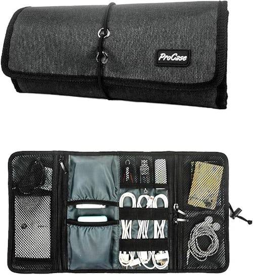 A cord organizer pouch with mesh pockets & elastic loops to keep cables tangle-free