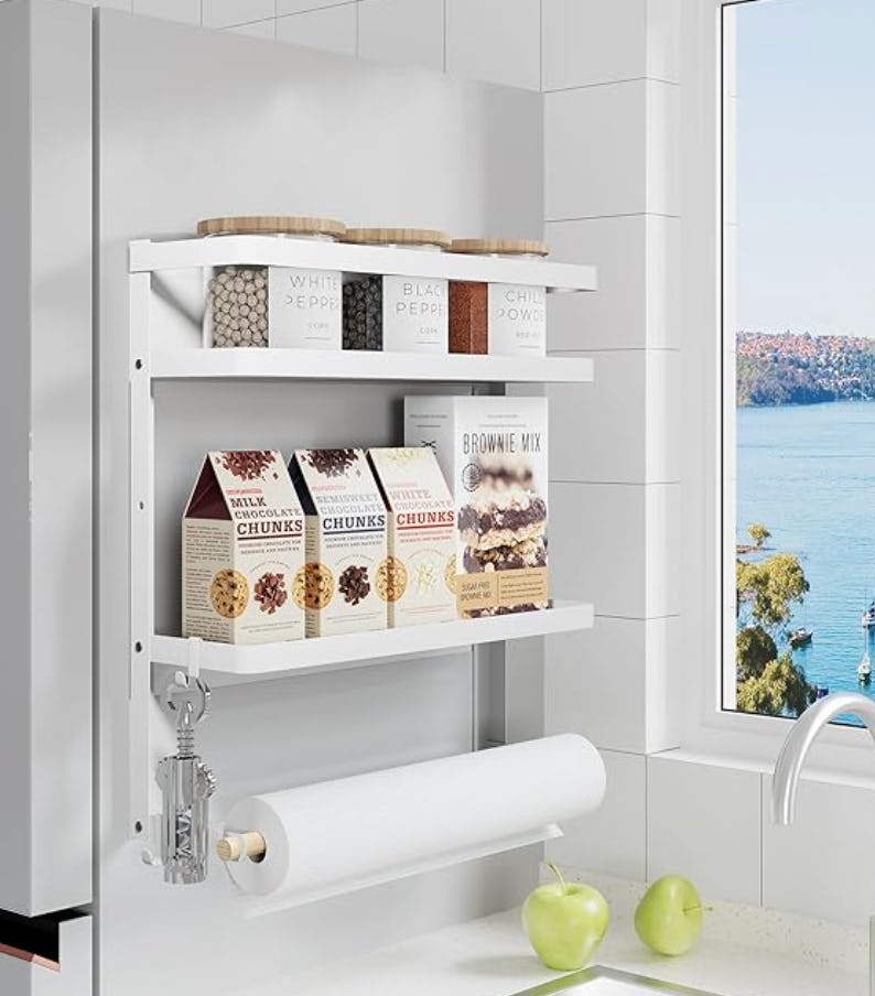 Free up cabinet space and create a tidy display with this sleek magnetic spice rack. Made of thick, high-quality stainless steel, it can hold up to five pounds. And, there’s a convenient paper towel holder on the bottom, making this a neat one-stop kitchen shop.