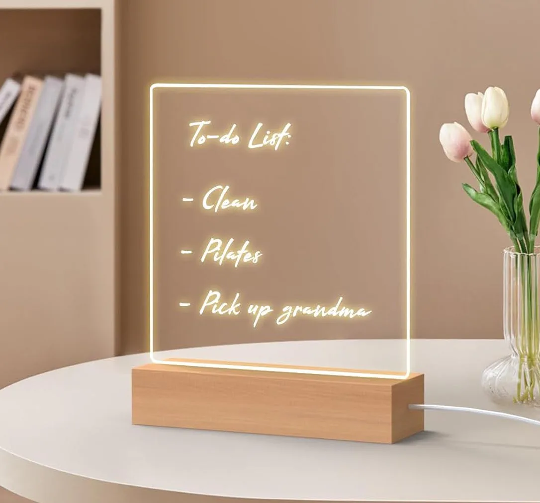 Turn simple reminders and notes into art with this light-up dry-erase board. Made from see-through acrylic, it sits on any desk, counter, or shelf and features an LED that casts a warm glow in your choice of seven colors. Use the dry-erase marker to write on it, erase, it and use it again.