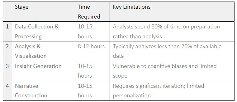 The traditional approach to business reporting typically involves a labor-intensive process consuming 35-70 hours per reporting cycle. This workflow progresses through several stages: