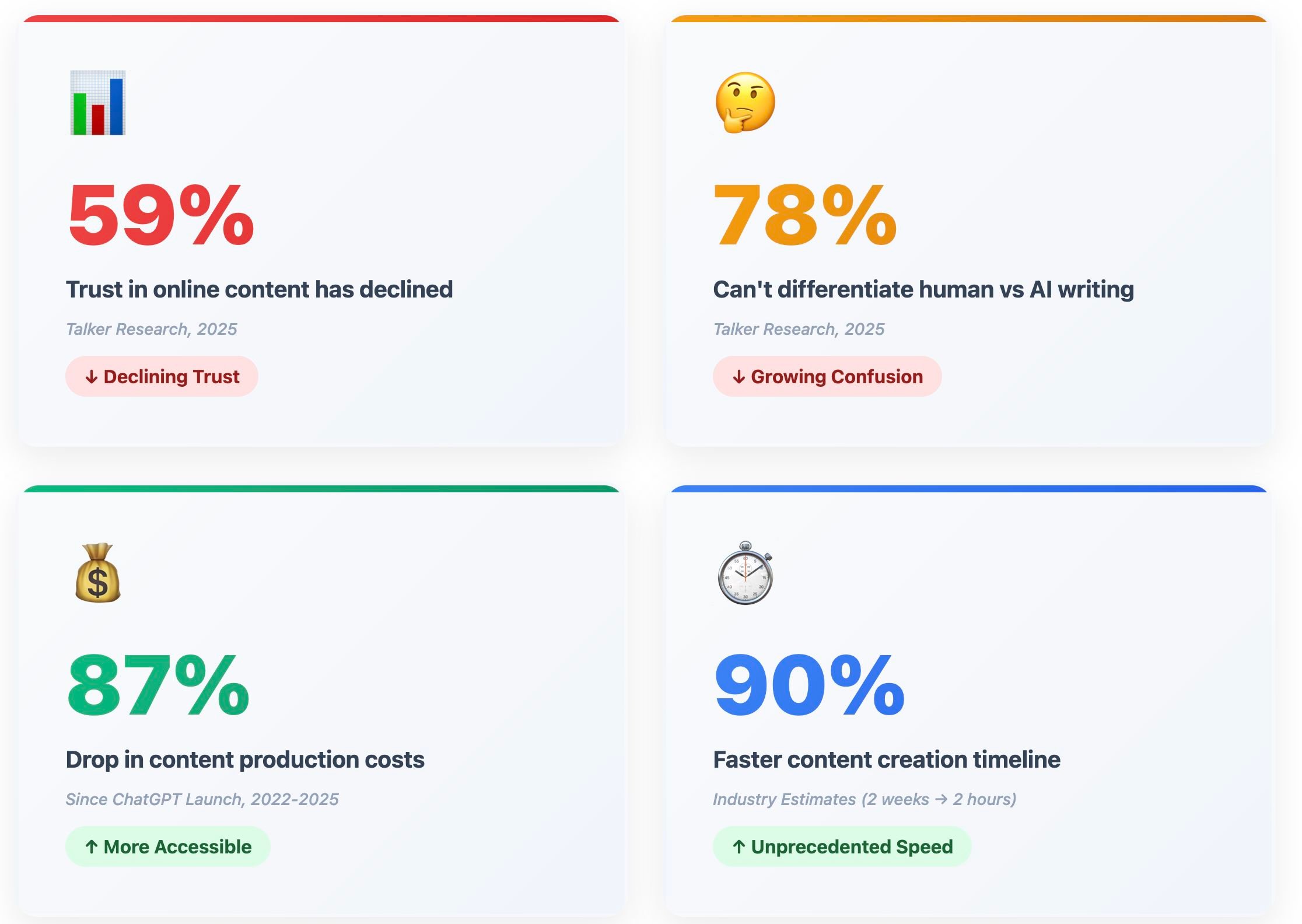 A 2025 study by Talker Research touches upon a growing trust issue. Among 2,000 participants, 59% said their trust in online content has declined. 78% said it’s becoming harder to tell whether something was written by a human or generated by AI.