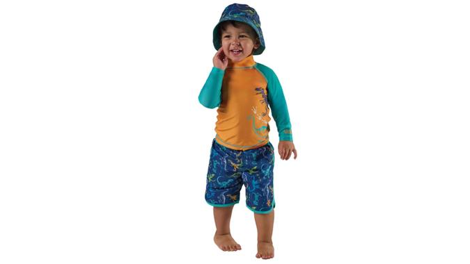 Each three-piece set includes a swim shirt, bottom and reversible swim hat in an adorable print. Shops kids’ sizes 2T up to 7 in dinosaur, shark, flower and unicorn patterns.