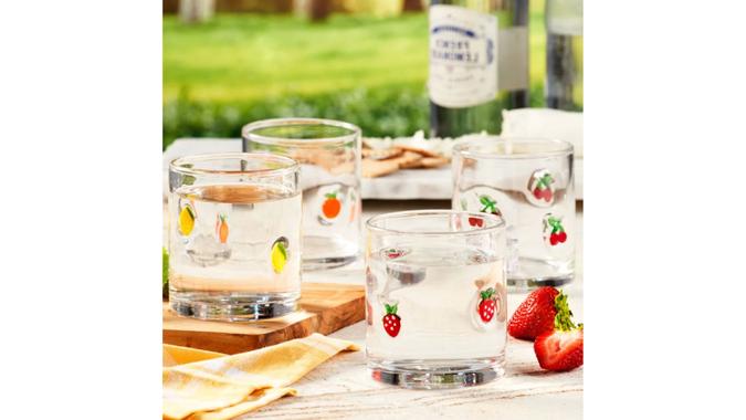 A set of four soda-lime glasses with colorful fruit embellishments retails for less than $35 at Costco. Meanwhile, a single icon juice glass at Anthropologie costs $16 or $64 for a set of four glasses.