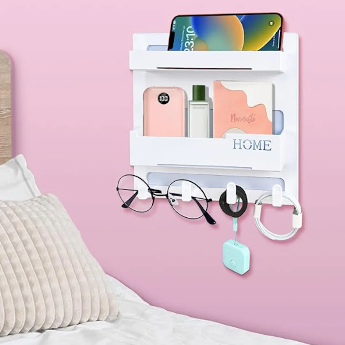 This bedside shelf has two trays and four hanging hooks to store your stuff. It measures 9.1 by 9.4 inches, and it holds up to 10 pounds at a time. It's perfectly sized for phones, TV remotes, and other lounging essentials. Strong adhesive pads on its back hold it in place with no drilling (so it's perfect for renters).