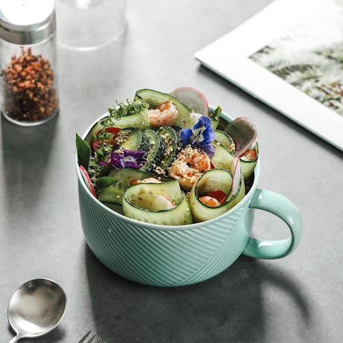 This oversized bowl is the perfect size for soup, salad, cereal, and more. It features a handle, so it’s easy to drink from and carry. It’s designed with a textured stripe pattern that makes it look more expensive than it is, and it’s available in nine stylish colors. By the way, it’s safe to use in the freezer, microwave, and dishwasher.
