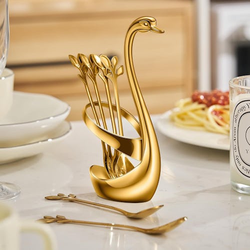 Add an elegant touch to your next gathering or just use this spoon set to upgrade your coffee station for a more luxurious experience. It features 10 tiny spoons with a feather design on the handles and includes a swan base to hold the spoons. The spoons are perfect for desserts, appetizers, tea, and coffee. Reviewers confirmed that the pieces are sturdy and great quality.