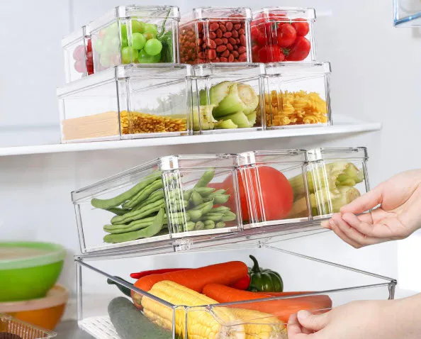 Fridge organizer bins with flat lids that make them stackable