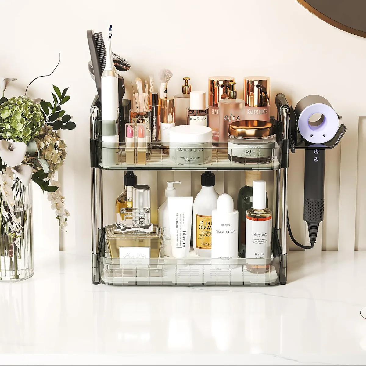 A counter organizer with 2 tiers & a hair tool holder