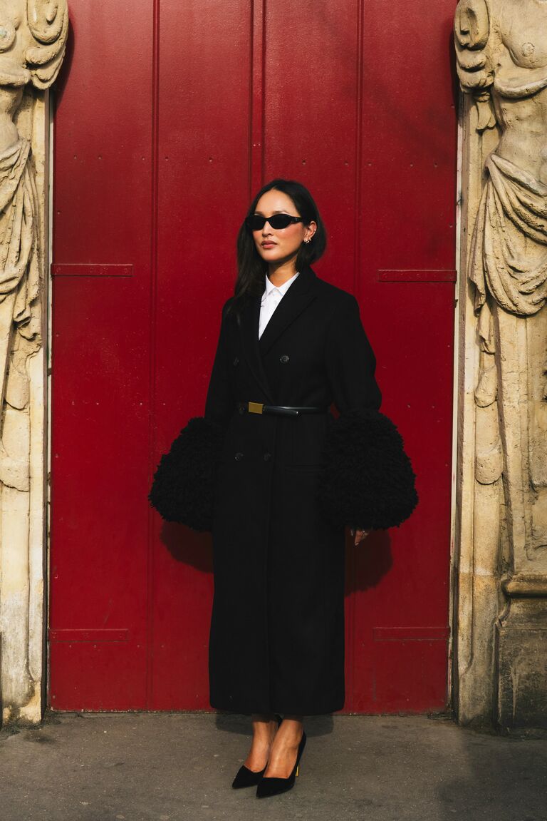 A guest at Paris Fashion Week wearing a fur trimmed coat.