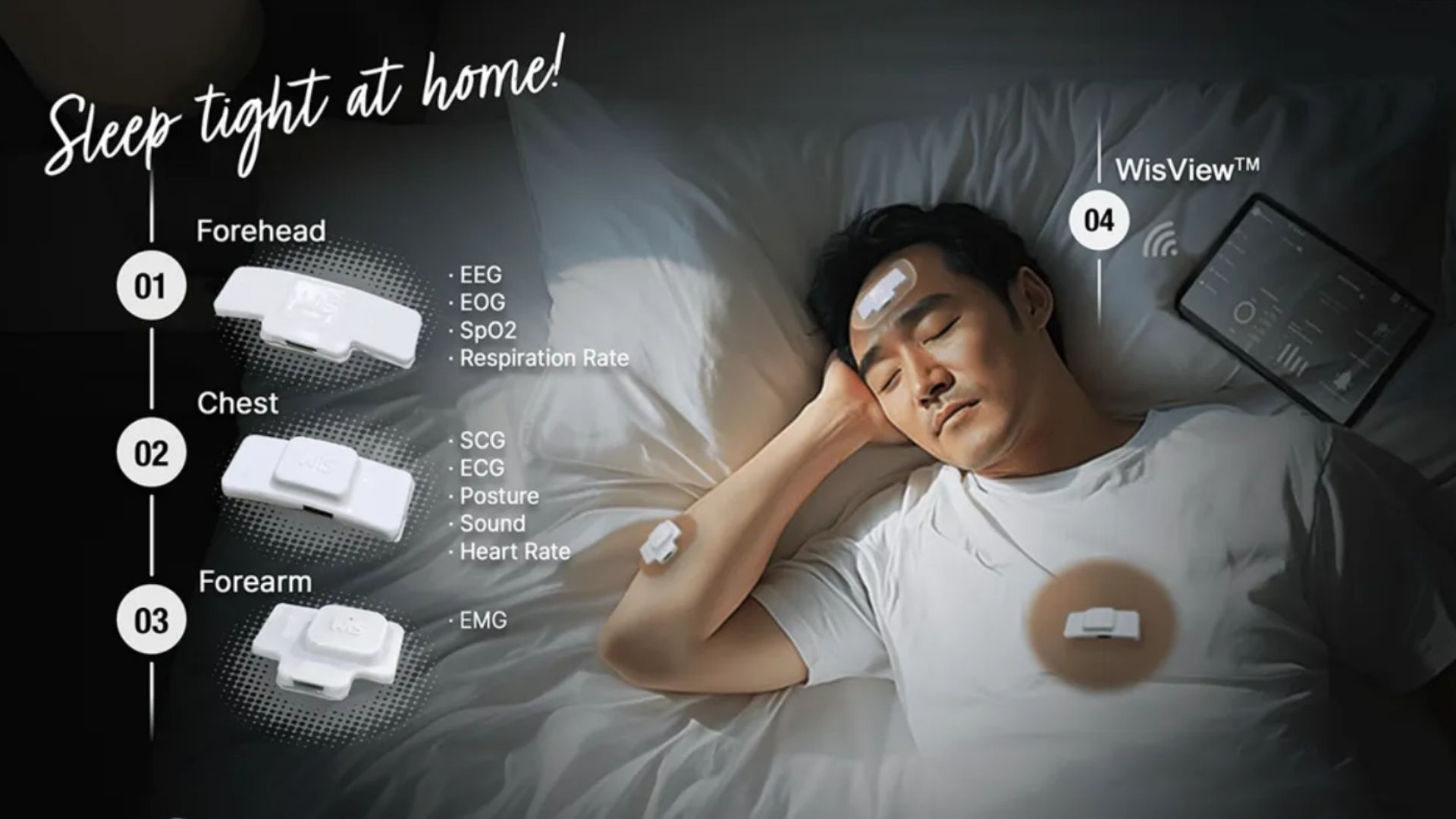 The adhesive-free patches attach to the forehead, chest, and forearm, without the need for any gels. They simultaneously measures EEG, ECG, EMG, SpO₂, heart rate, respiration rate, snoring and posture.