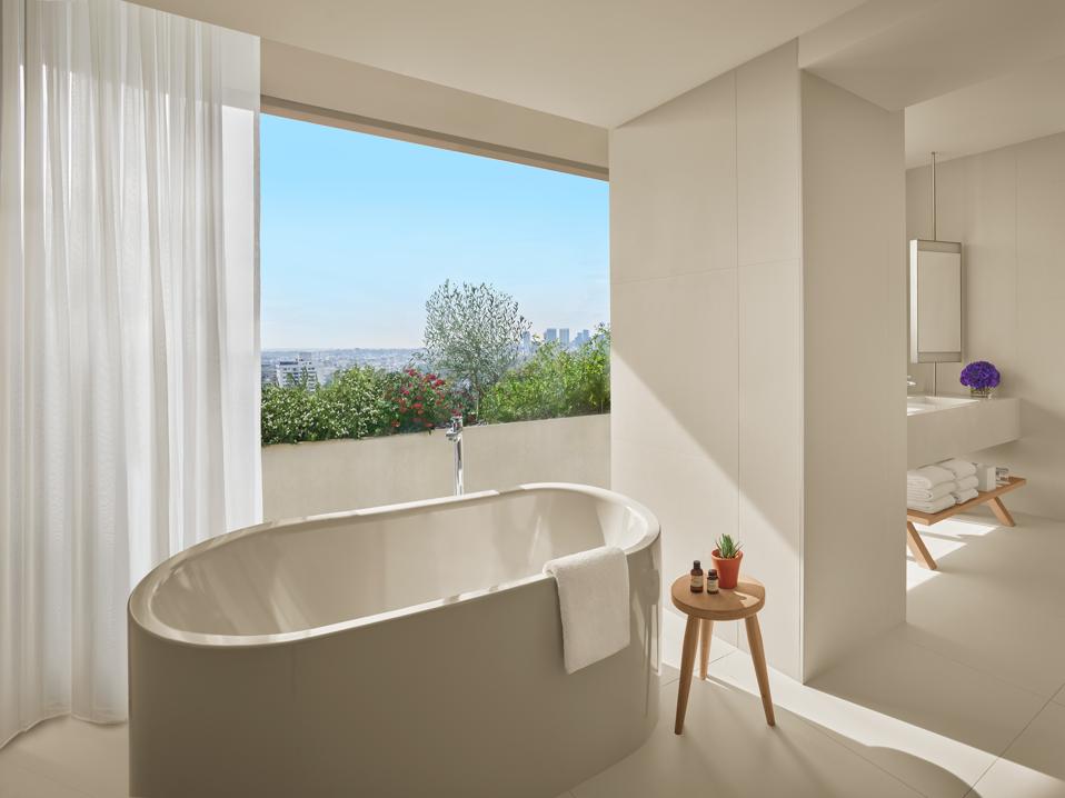 For a standout wellness experience, book the hotel’s unique Vitality Suite which comes with gym equipment, a Peloton bike and water rower for personalized workouts streamed from your TV screen. Refuel with a special “vitality menu” and your own personal in-room refreshment center. Customizable water pressure in your shower, a la carte pillow menus, immersive sound therapy and luxurious Lunya sleepwear ensure optimal recovery too.