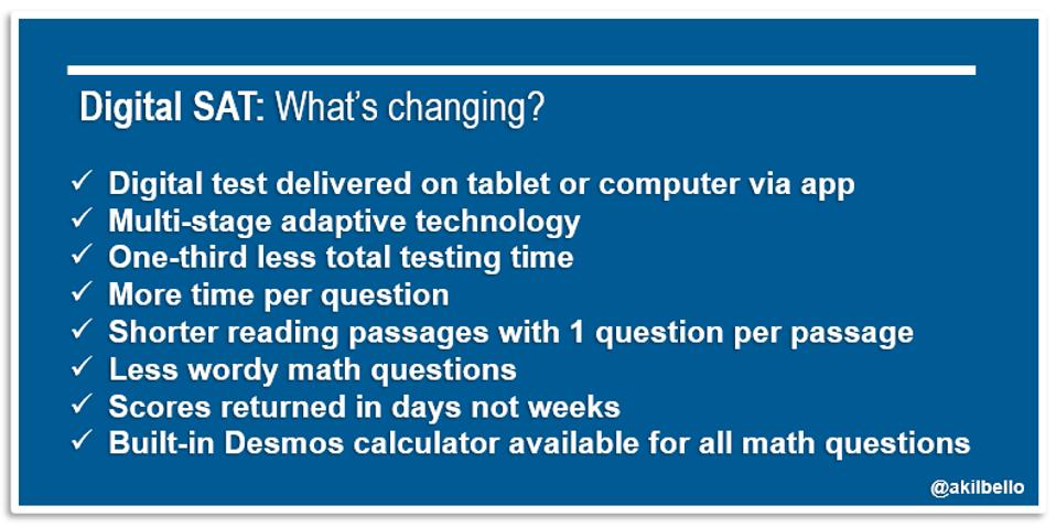 These changes may have been overdue since they will only bring the SAT in line with modern assessments. Many statewide assessments have been digital for more than a decade, starting with Oregon’s TESA in 2001. Like the GRE, which has been digital for the last two decades, the SAT will use “multi-stage adaptive” technology to deliver a unique set of questions to each test taker and determine their score. A proprietary testing app will be downloadable onto personal or school laptops, tablets, or Chromebooks but the test will continue to be proctored in schools and test centers.