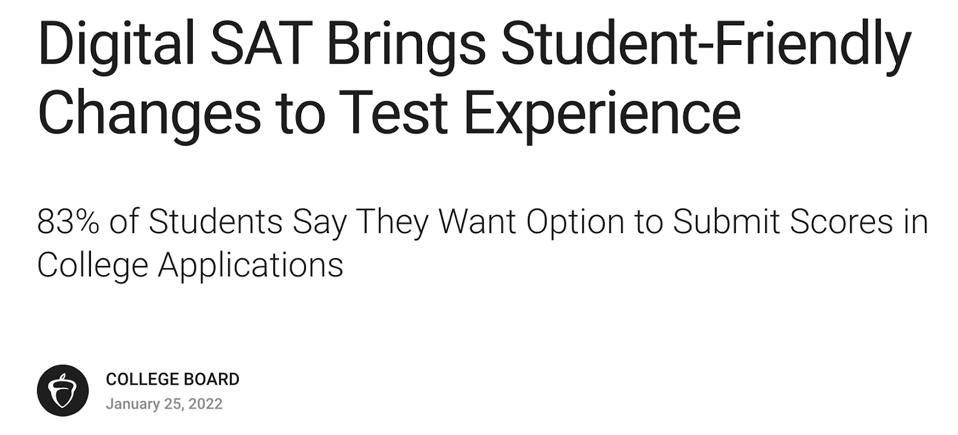 Like the ads for the iPhone 13’s cinematic mode that you never use and its super duper Retina XDR display that you never notice, the digital SAT is a product in search of customers, marketing upgrades no one asked for. The College Board’s primary customers —colleges that use scores or buy test taker names— have been dropping test score requirements. Nearly 80% of U.S. institutions have become test optional and almost 100 schools have gone a step further and stopped considering scores entirely. In this shrinking market, The College Board’s marketing implies that students “want” to take the test and that the latest changes are necessary, customer-focused, and address the problems of the previous product.